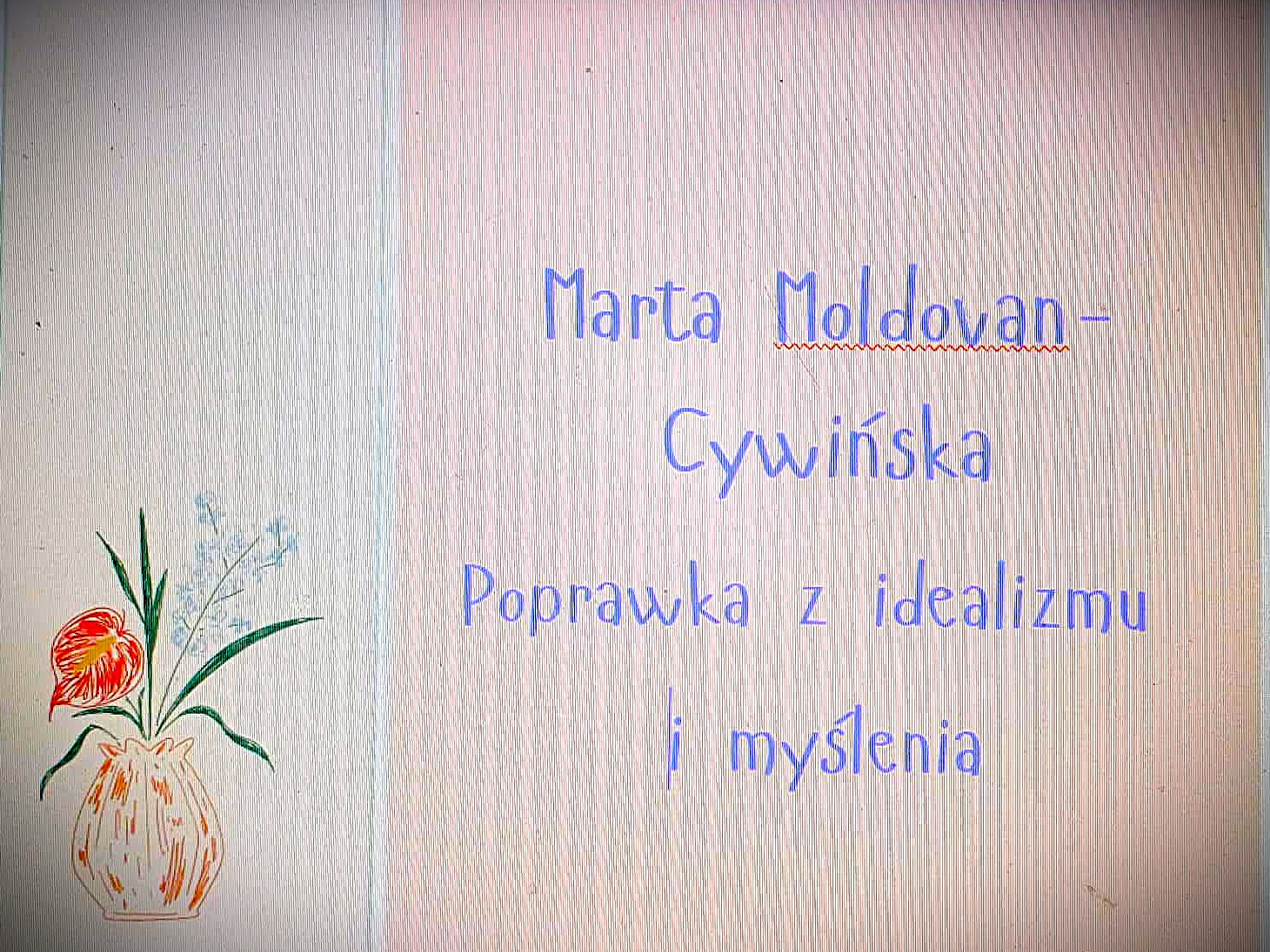 We wrześniu b.r. ukazała się najnowsza książka Marty Moldovan-Cywińskiej, wydana staraniem gdańskiego wydawnictwa Editions de la Harpe, zatytułowana "Poprawka z idealizmu i myślenia", której projekt graficzny przypomina dziewczęcy pamiętnik z lat 70-tych minionego wieku. To książka nietypowa, inna niż wszystkie dotychczasowe Moldovan-Cywińskiej. Zawiera ona bowiem krótkie formy eseistyczno-filozoficzne w konwencji wpisów w pamiętniku ( a może dzienniku intymnym?), słowem: uniwersalne zapiski dedykowane ulubionemu filozofowi autorki. Jakiemu ? Ci, którzy ją dobrze znają, zgadną natychmiast, nowi czytelnicy odkryją go na kartach książki.